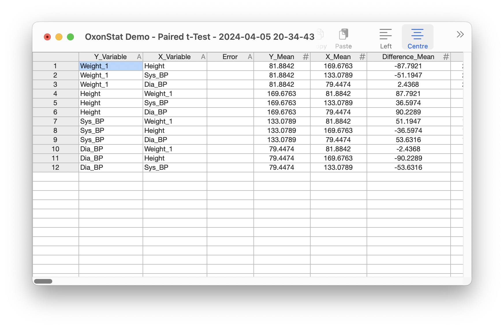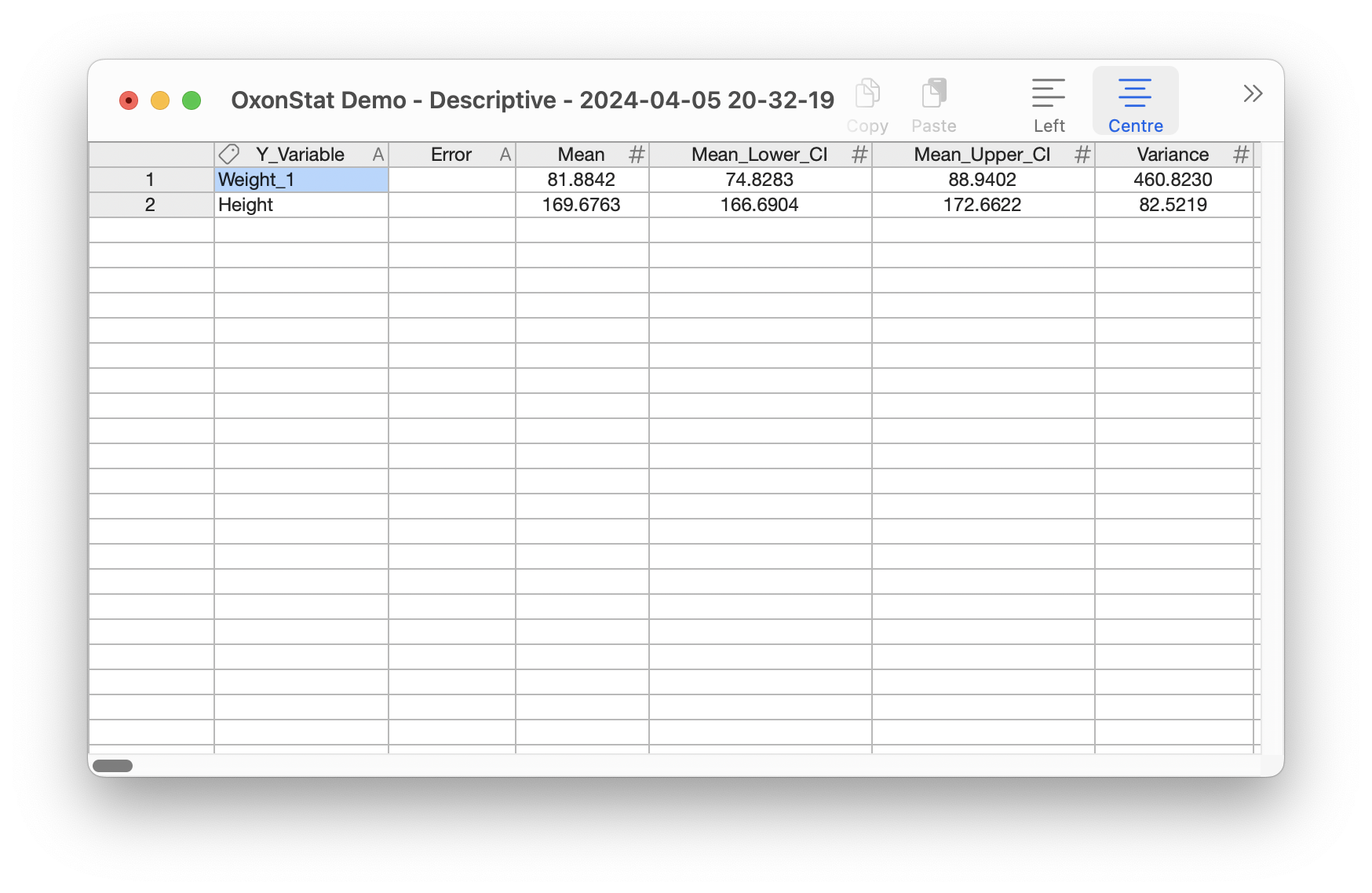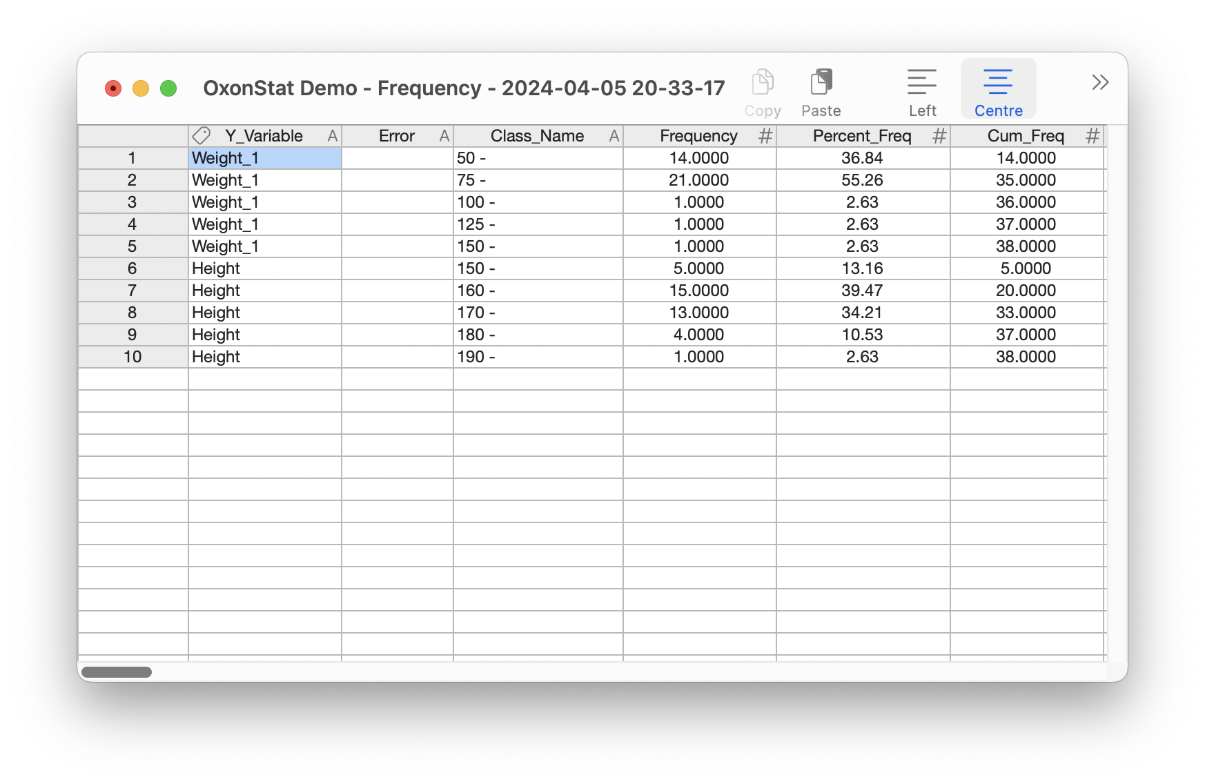OxonStat can output any of its analyses to a new dataset with columns for each analysis parameters. Each row represents the output of an analysis. For some analyses, such as Frequency, more than one row is output for each analysis.