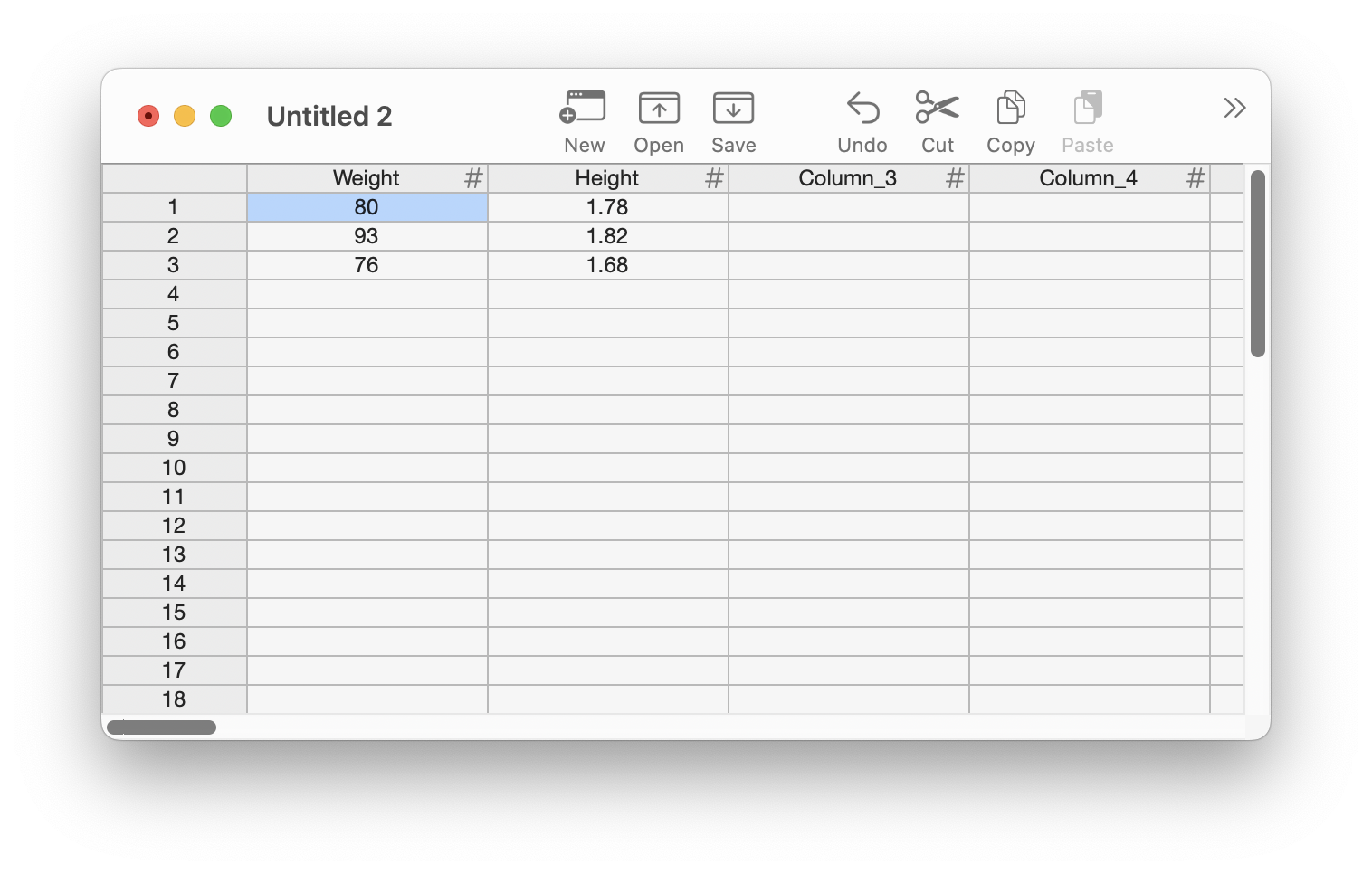 In OxonStat life is simpler. You create a Column named Weight and another named Height and enter some data.