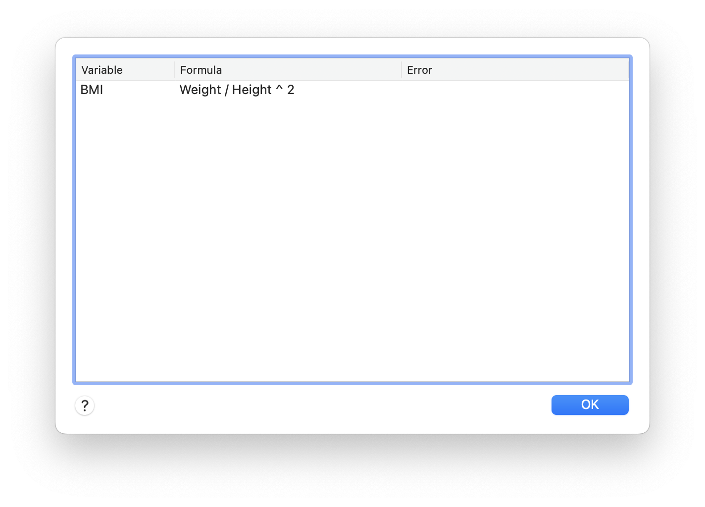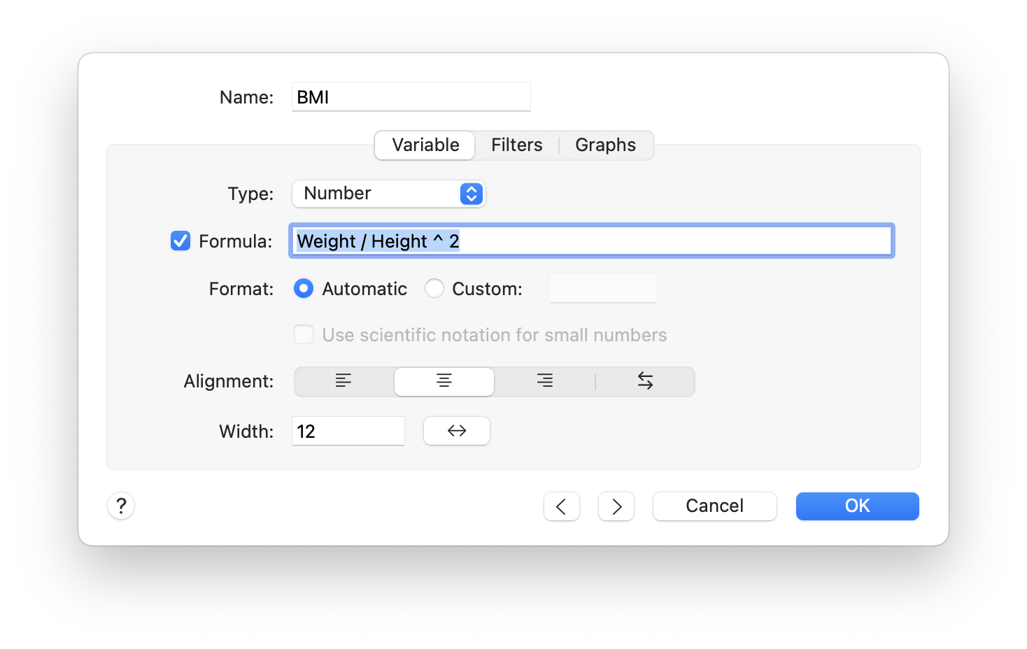 You can then create a new column called BMI, and assign it a formula of "Weight / Height^2" and press OK.