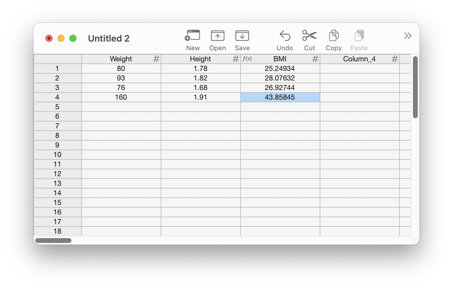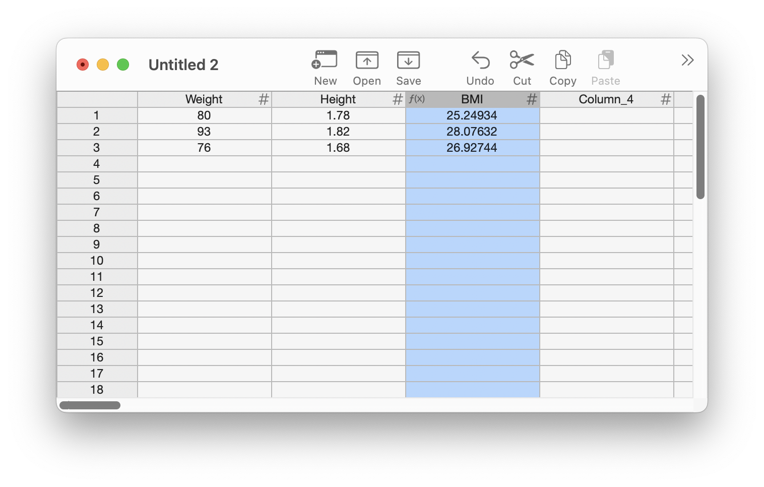 Entering new values for Weight and Height automatically calculates the results for BMI, even if you add rows to the Dataset. Obviously, altering a Heght or Weight causes the BMI to be recalculated accordingly.